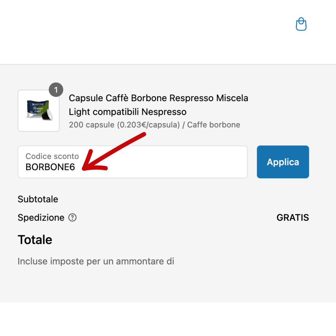 Prima di procedere con il pagamento, inserisci il codice sconto "BORBONE6" nell'apposito campo.